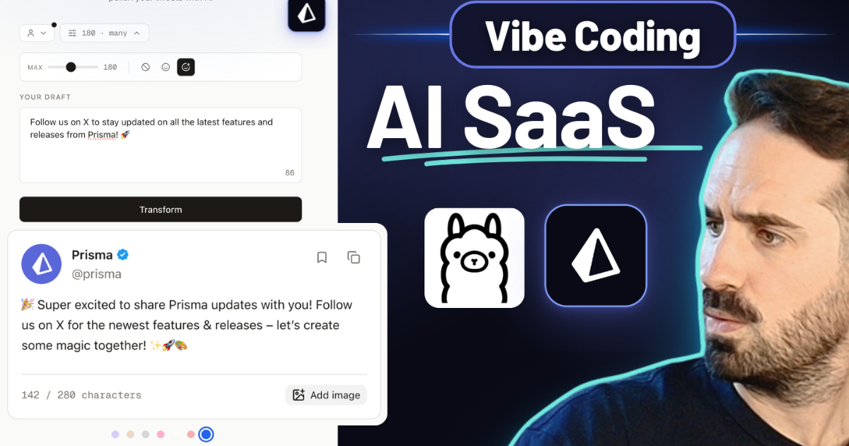 A complete vibe coding tutorial: build a tweet polishing app from scratch using Next.js, Prisma ORM, Prisma Postgres, UploadThing, and a local LLM with Ollama.