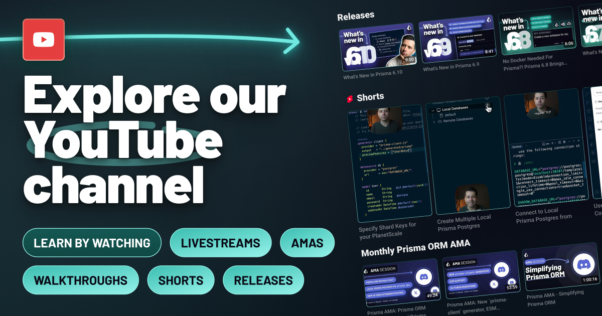 Discover Prisma's YouTube channel for expert database tutorials, release walkthroughs, and live AMAs. Learn to build better apps with our weekly videos on ORMs, databases, and modern development practices.